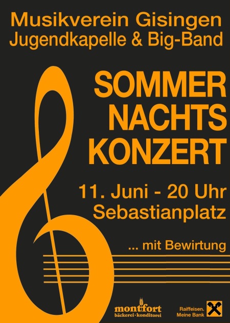 Der Musikverein Gisingen lädt am Freitag, 11. Juni, um 20.00 Uhr recht herzlich zum Sommernachtskonzert ein. Vor der malerischen Kulisse der Pfarrkirche und der Volksschule wird die Jugendkapelle den Abend eröffnen, gefolgt von einem Konzert des Musikvereins. Zum Ausklang unterhält Sie die Big-Band mit flottem Swing. Für Bewirtung ist bestens gesorgt – der Eintritt ist frei.